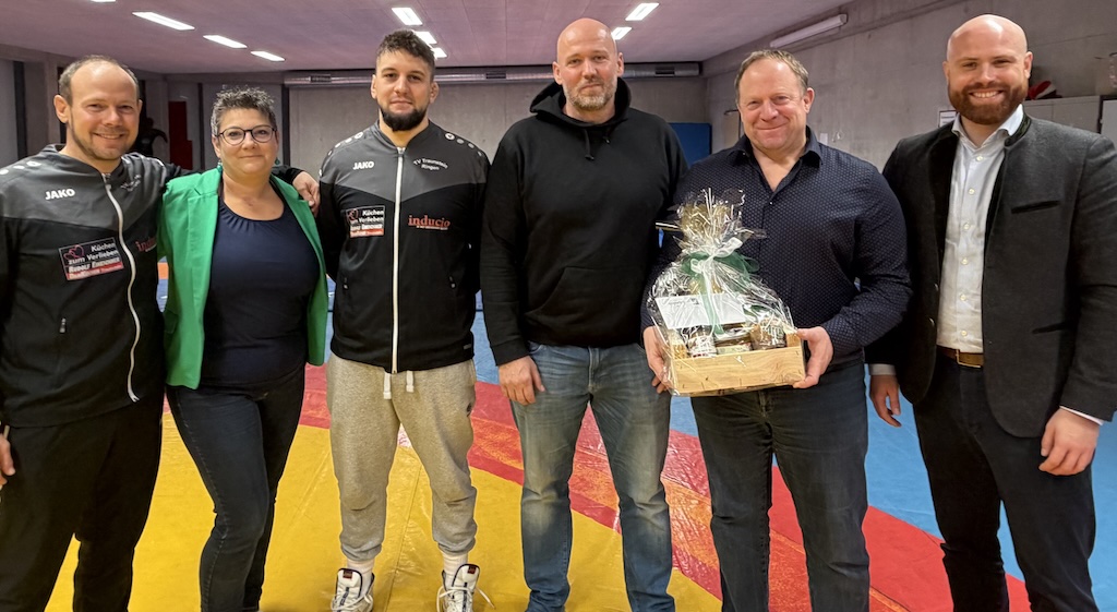 Veränderung in der Abteilungsleitung der Traunsteiner Ringer. Von links: Der neue Abteilungsleiter Ralf Schwabl-Himmler, Geschäftsführerin Sabine Himmler, 2. Abteilungsleiter Kevin Daiker, Jugendleiter Stefan Pribil, der scheidende Abteilungsleiter Hartmut Hille und Vereinsvorstand Konrad Baur. © Andreas Wittenzellner